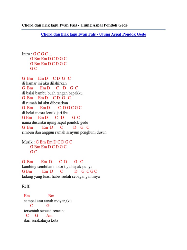 Chord Dan Lirik Lagu Iwan Fals Ujung Aspal Pondok Gede - Em d c d g g4 nama dusunku ujung aspal pondok gede g bm em d c d g g4 rimbun dan anggun ramah senyum penghuni dusun.
